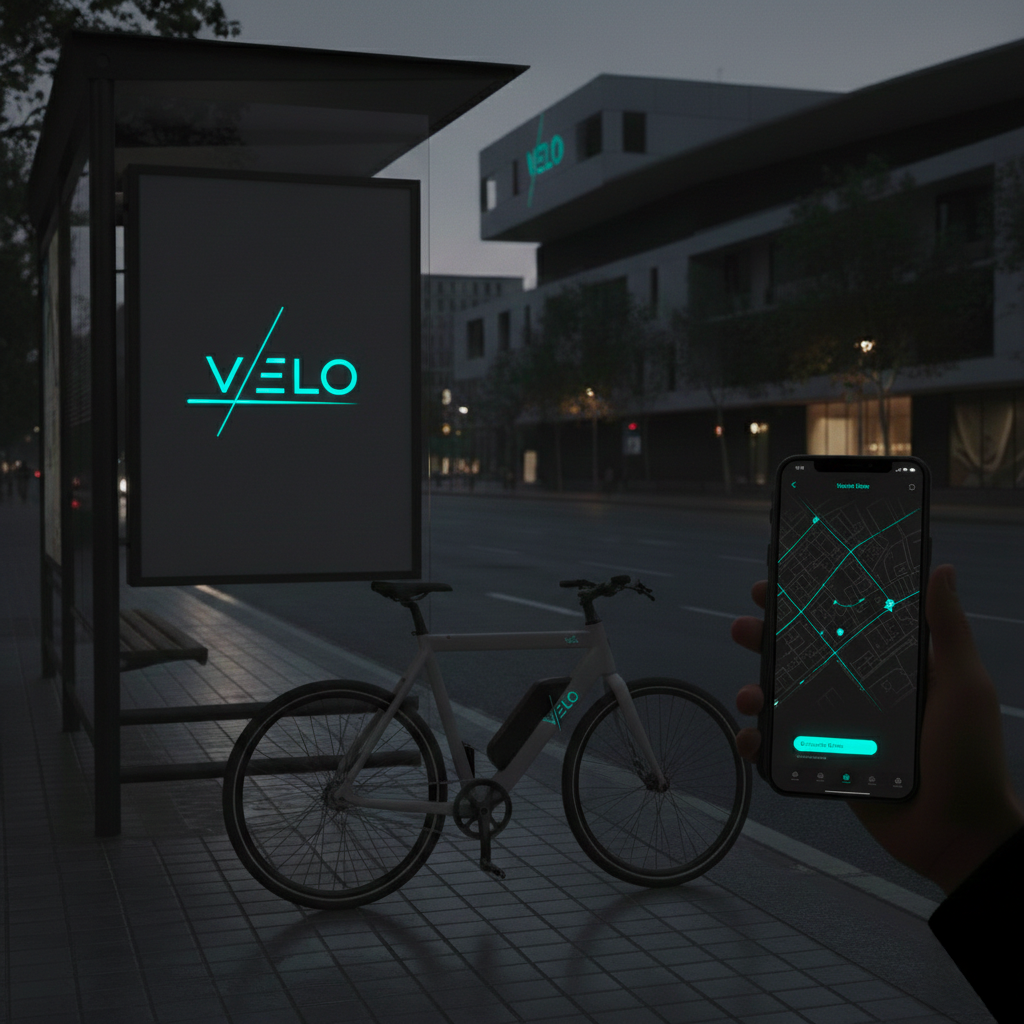 The Solution: the identity focuses on "Velo" (Speed). A sleek, dark-mode visual system combined with high-contrast electric accents ensures visibility and a high-tech feel across digital interfaces and city streets.